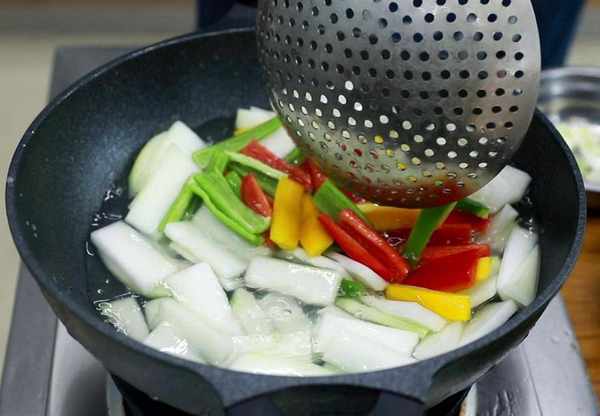 2.烧半锅开水,倒入冬瓜焯水20秒钟,再倒入彩椒片稍微烫一下捞出来备用。