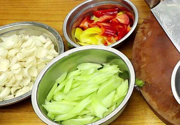 2.准备一小把芹菜,把表面的粗纤维刮掉,以免吃的时候塞牙,把比较大的破开斜切成小段,再切一些彩椒片,用来配色。