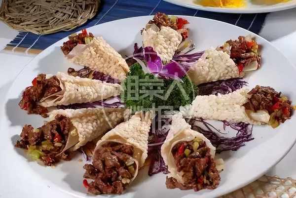 2.锅巴过油肉,卷成斗状卷,春卷皮过油后卷好放入锅巴内。