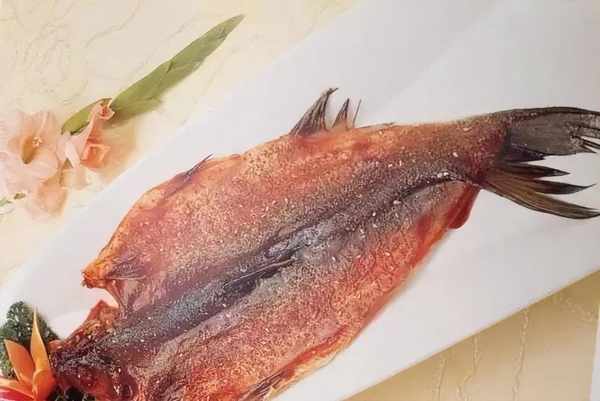 4、烤盘上垫另一半配料,鱼背朝上放在配料上,入烤箱烤制,烤至鱼熟、呈金红色时取出。配葱丝、巢湖虾酱佐食。