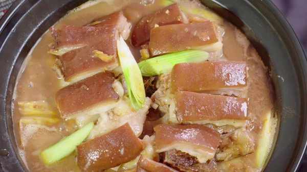 1.先加工猪脚,加入生姜、八角、桂皮、白芷、草果等放入高压锅压制15分钟。