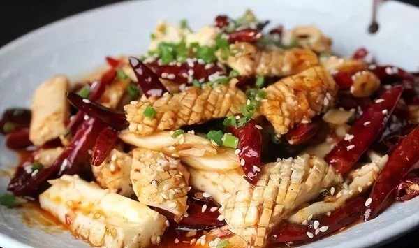 2.净锅放热油,放干辣椒节和青红花椒煸炒出香,再加香辣酱和火锅底料炒散,倒入炸过的黄喉炒匀,再放入葱节,起锅装盘,撒熟芝麻和葱花即成。