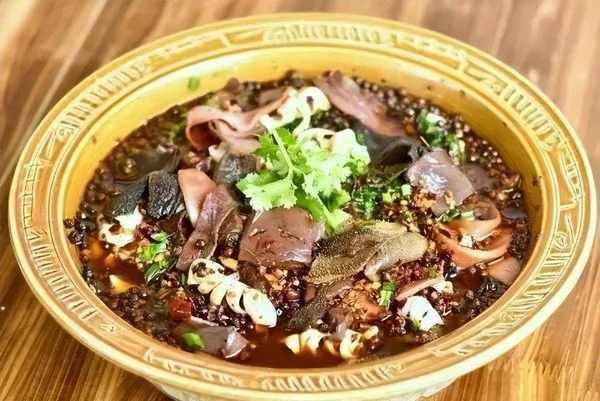 说明:该菜的特色在于酸辣汁,汁水调好后,直接浇淋在盆中,无需烧热,否则会影响口味。汁水中也可不放醋,成麻辣口味,依然别致。另外,烹制过程中不用勾芡。
