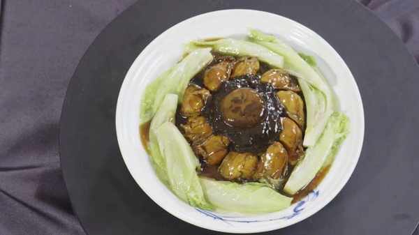 3、将所有食材放进一个碗里,再蒸一两分钟,然后扣到碟子上。下盐、味粉、糖、油到水中焯生菜伴碟。最后将焖蚝豉的汤汁加热一下,下生粉水勾芡,淋到发菜上,即可