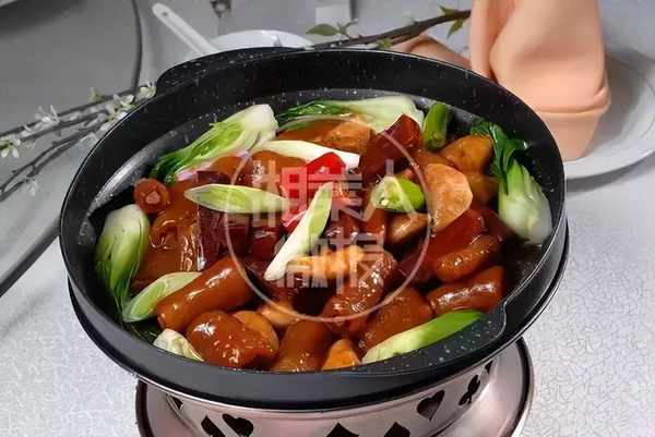 1.鲜猪血纳盆,调入少许盐,加入清水,冷却凝固后改刀成大小均匀的块。黄鳝治净,切成段。鲜毛肚、黄喉洗净,切成片。三明治火腿切片。将以上原料分别下锅汆熟,捞出待用。