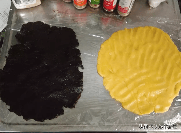 3、面团分成两部份,一部份加入可可粉,另一部分加入奶粉,将两部份的面团杆平,叠起,稍微压平,切半,重复此部分至少3次,最后整形成方正的长条状即可。