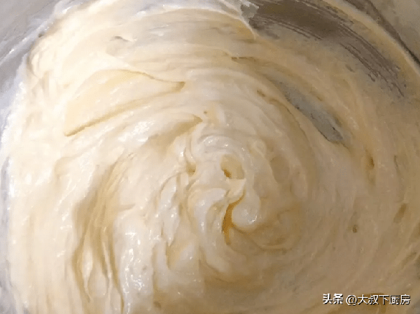 2、鸡蛋和水(或牛奶/豆浆)混合均匀,一点一点加入打发奶油中搅拌均匀,奶油会呈现羽毛状,千万不要一次加入,容易搅拌不均匀,分2~3次加入过筛后的低筋面粉,用压拌的方式搅拌,拌到看不见粉,用压拌是为了不要让面粉出筋,影响口感。