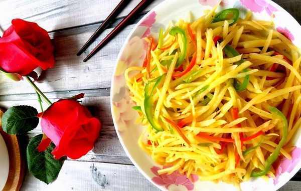 食材:土豆 80g、青椒20g、胡萝卜10g 油1勺、盐2g、醋少许、花椒粉 2g