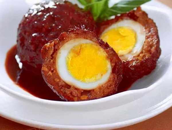2.将去皮的熟鸡蛋分别包入肉馅中,做成5个大丸子。