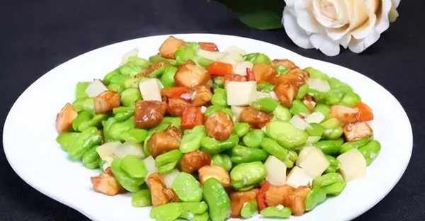 5、下入滑过油的鸡丁及蚕豆、春笋丁、红椒丁,加盐3克、鸡精3克、白糖2克调味,大火翻炒至断生