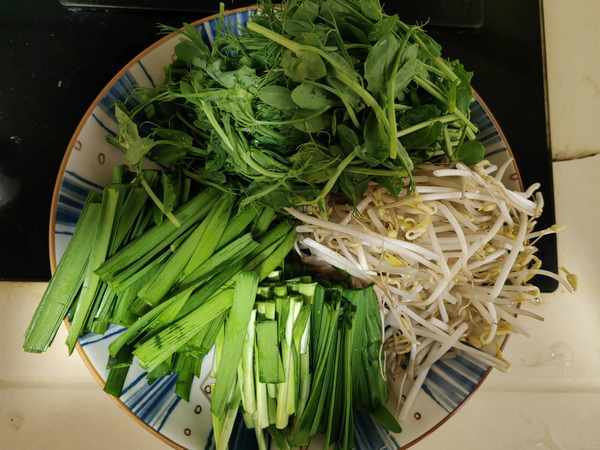 小锅米线必不可少的三件套:豆芽、韭菜豌豆尖。