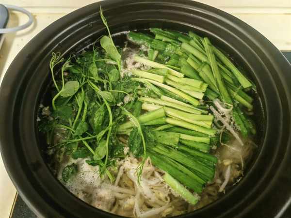 放入米线、豆芽、韭菜和豌豆尖