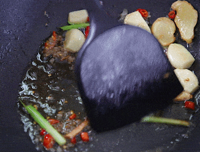 7、开盖大火收汁,加入九层塔炒软一些,焖10秒即可。