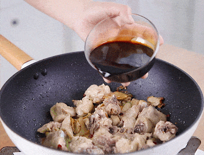 6、倒入调好的料汁,翻匀中小火焖10分钟。