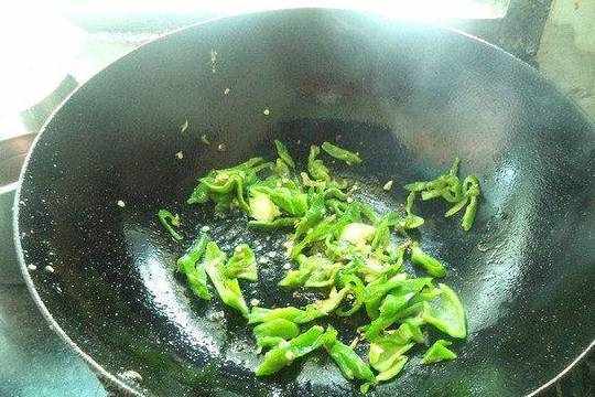 11.再另起锅烧油下入青椒丝放盐炒匀