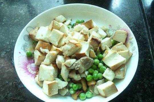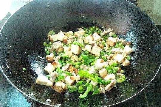 12.进炒好的肉,豆腐干,豌豆炒匀。