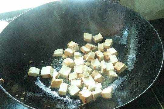 8.另起锅烧油下入豆腐丁炒匀。