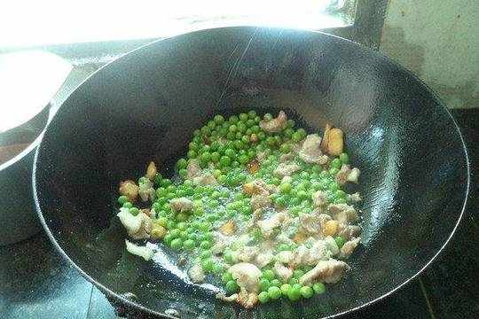 6.再倒进豌豆放盐炒香待用。