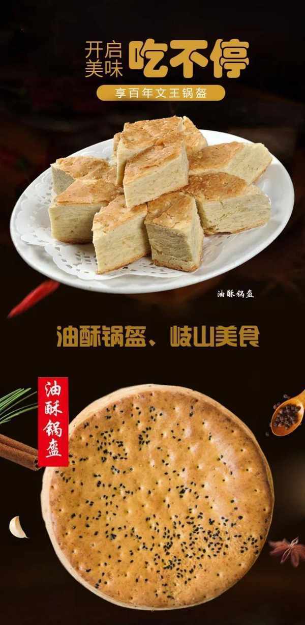 岐山油酥锅盔制作工艺独特而精细,素以"干、酥、白、香"著称西府,闻名西北,极受省内外享用者的赞誉。