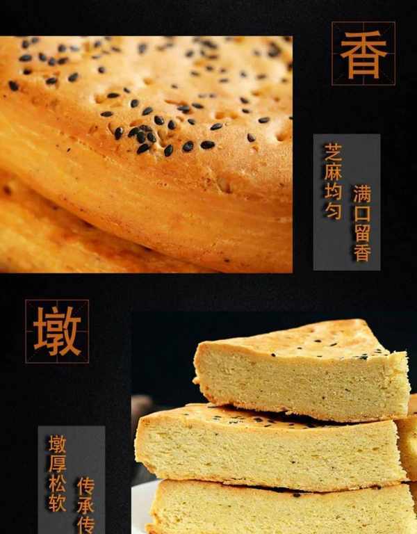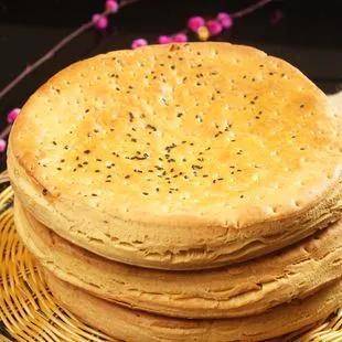 制作时和面加入盐、油、香料,再用木框反复拌压,表面粘上芝麻,小火烤烙而成,色黄皮脆,味道香美。