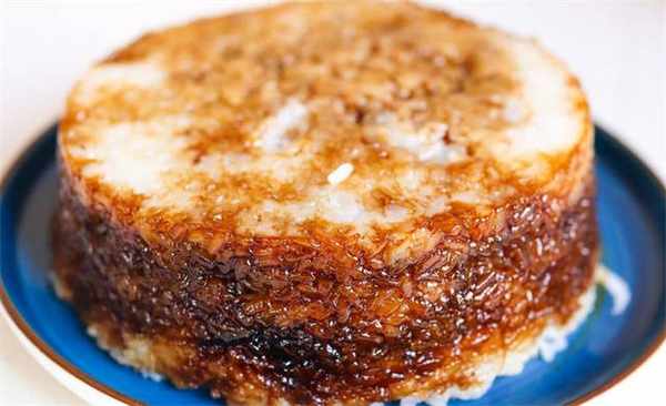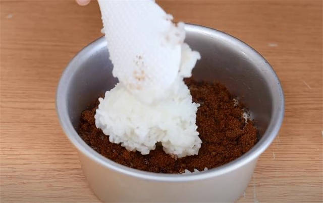 3.大约30分钟的时间,糯米已经蒸熟了,拿一个模具出来,里面刷上油防粘,在底下先铺上一层糯米饭,然后再铺上一层红糖。