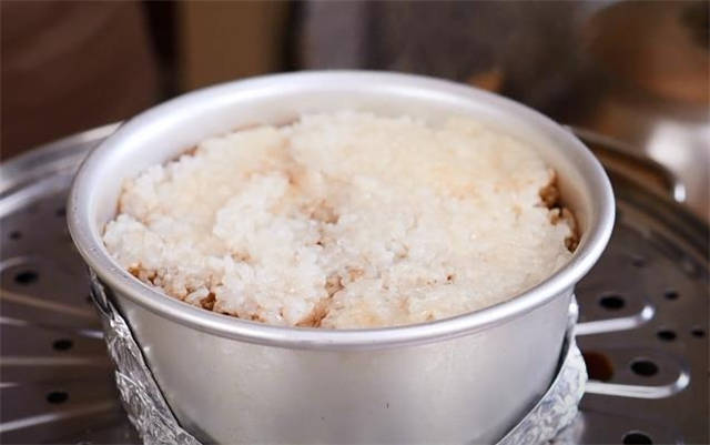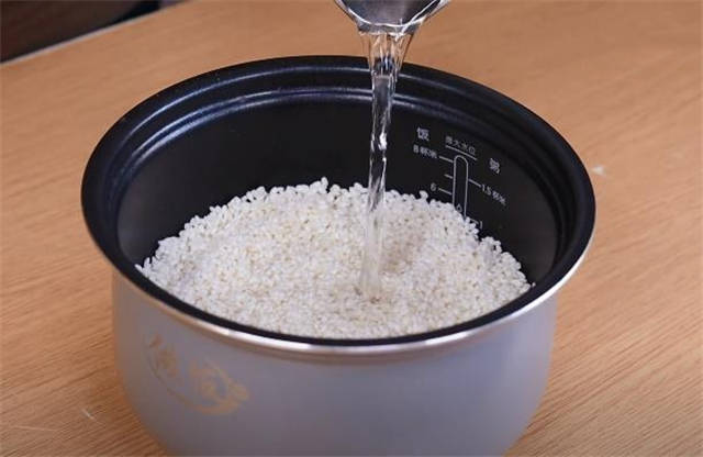 2.把糯米倒进电饭锅,加入适量的清水,按照平时蒸米饭的程序把它蒸熟。