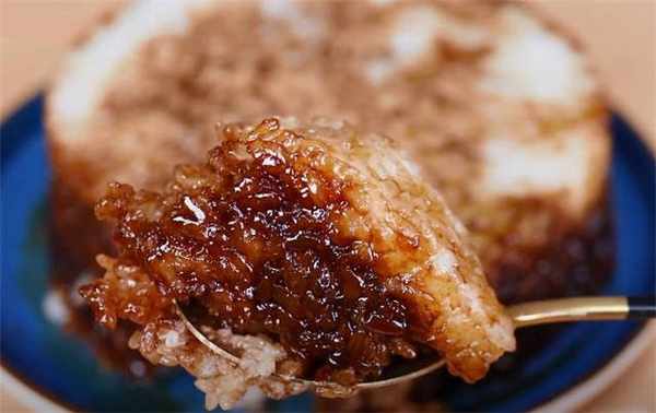 5.上面扣一个盘子,倒扣出来就可以开吃了,糯米不用提前泡发,这样制作起来更简单,里面的夹心可以放些红枣和葡萄干增加风味,味道也会更好吃。