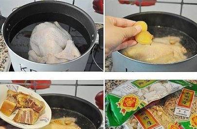 土鸡洗净,凉水入锅,水量要加足;旺火煮沸后,撇净浮沫,加入姜片;放入金华火腿,火腿是咸的,所以就不需要再放任何调味料了;