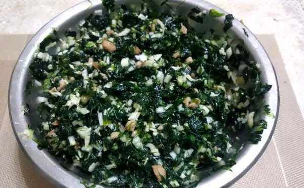 4.把剁好的海菜和攥干水分的白菜末拌在一起。