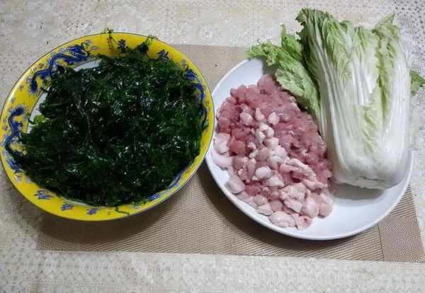 1.宽叶海菜用清水漂洗干净,洗净后攥干水分剁碎,五花肉把肥瘦肉分开都切成拇指大的丁,白菜心清洗干净后切成碎末,加入盐出水分后攥干备用。