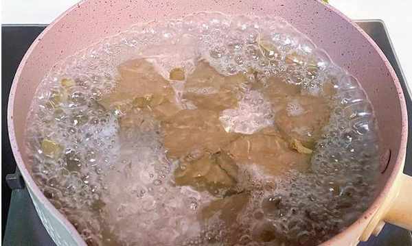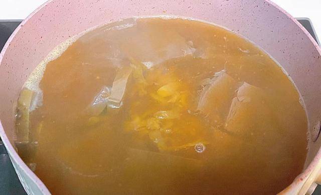 第四步:锅中烧热两碗清水,将其大火煮沸,水开后下入两勺黄豆酱,放入一些榨菜丝,大概煮3分钟左右。