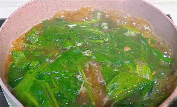 第五步:倒入焯水好的鸭血(建议用料酒去腥焯水),盖上锅盖煮3分钟,最后下入一些菠菜,等待菠菜煮至变软。