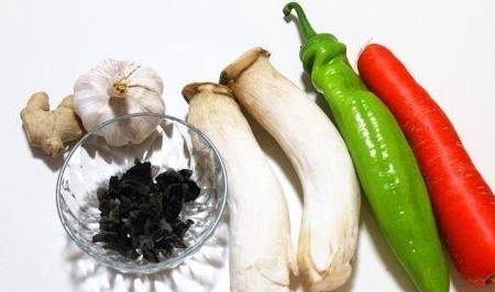 1、备好食材。木耳提前泡发,杏鲍菇洗净。杏鲍菇4个切丝,胡萝卜切丝,木耳切丝,蒜姜切末。