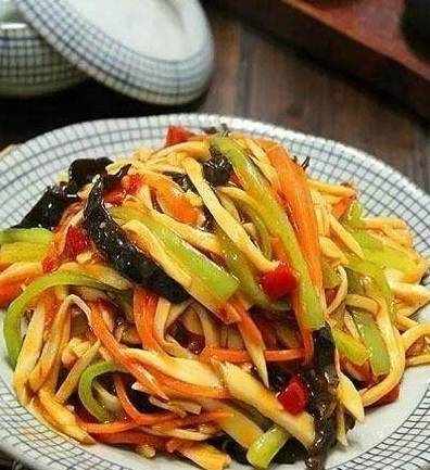 5、放入杏鲍菇丝,木耳切丝,下胡萝卜丝炒两分钟左右,胡萝卜变软。倒入鱼香汁翻炒均匀即可出锅。