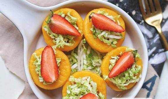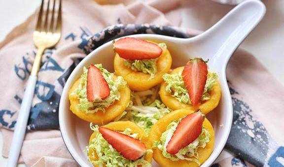 【玉米窝头沙拉】玉米粉100克,糯米粉60克,草莓适量,胡萝卜半根,清水适量,娃娃菜2片