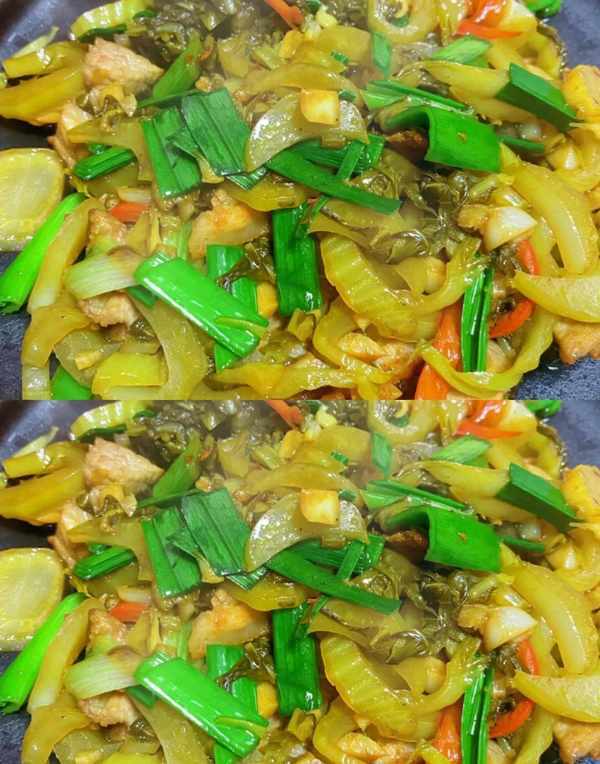 这是做好的酸菜我和蒜苗一起炒的,特别开胃下饭,你们快去试试吧!