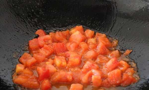 重新起锅,倒入少许油,油热后葱花爆香,倒入番茄块儿,大火翻炒出汁。