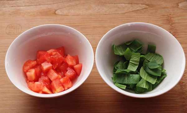 制作燕麦粥时,咱们可以搭配一些蔬菜,比如酸甜可口的番茄和清爽的小青菜。先把配菜清洗干净,西红柿用开水烫一下,去掉外皮再切成小块儿,小青菜切成段备用。