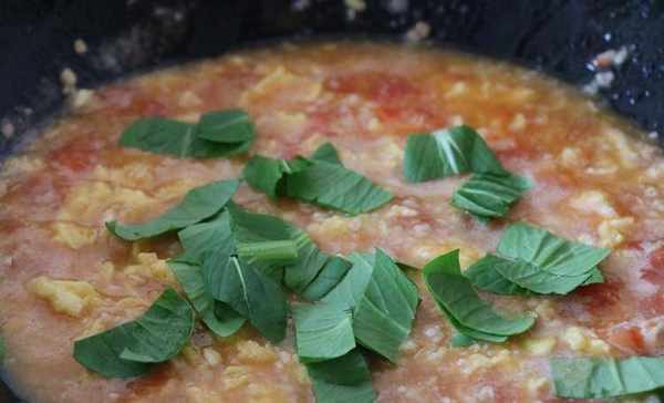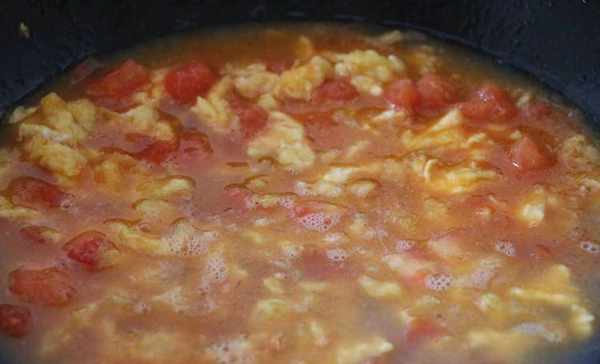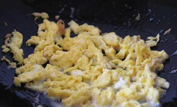 再倒入刚刚炒好的鸡蛋碎,翻炒均匀。倒入适量的清水,并把水煮开,水的多少可根据食用的人数灵活掌握。