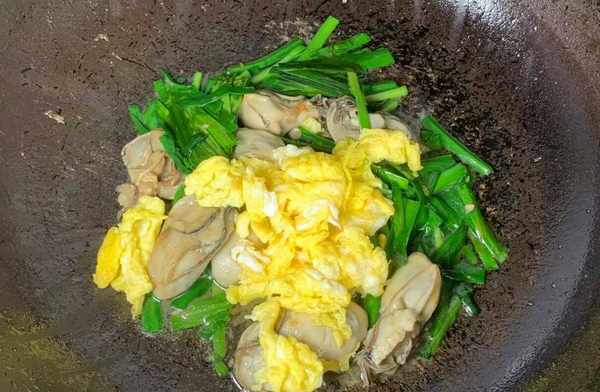 4、锅中再次加入食用油,油温热后倒入蒜末姜末煸炒出香味,再倒入生蚝肉,加入少许的生抽继续翻炒。待生蚝炒出汁水倒入煎好的鹅蛋块,加入适量的盐用铲子翻炒均匀后,再放入切好的韭菜炒熟后就可以取出装盘了。(这道菜不需要加太多的调味品,否则就会掩盖住生蚝和韭菜的鲜味。)
