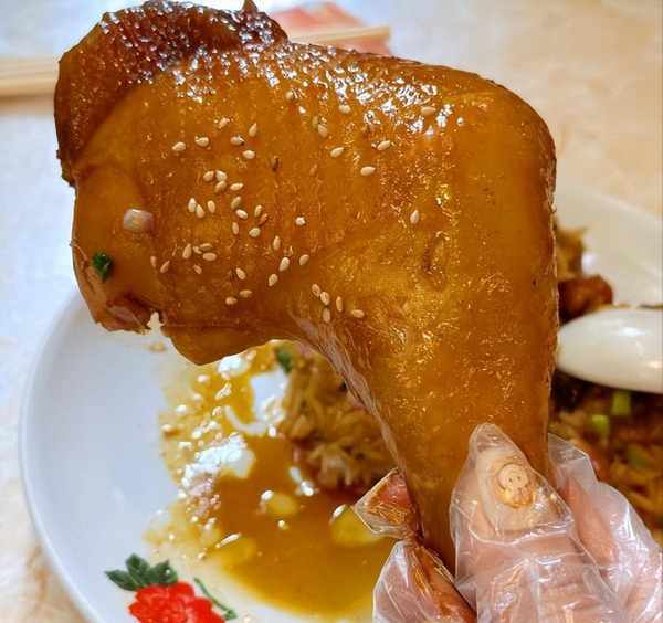 小伙子看不少客人点的都是这个鸡腿糯米饭,价格也不贵才22元,于是跟风点了一份,不一会糯米饭就端上来了,端上来后他还以为自己看花眼了,因为鸡腿真的很大一只。这一份饭是用一个盘子端上来的,鸡腿足足占了一半的位置,旁边是配料丰富的糯米饭。