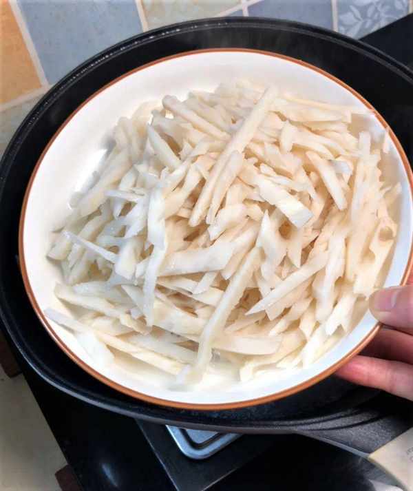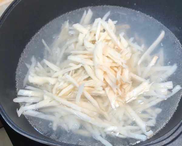 2. 藕丝焯水:莲藕去皮切丝。锅中水开,滴几滴白醋,放入藕丝烫个3~4秒,过一下冰水、捞出沥干水分。