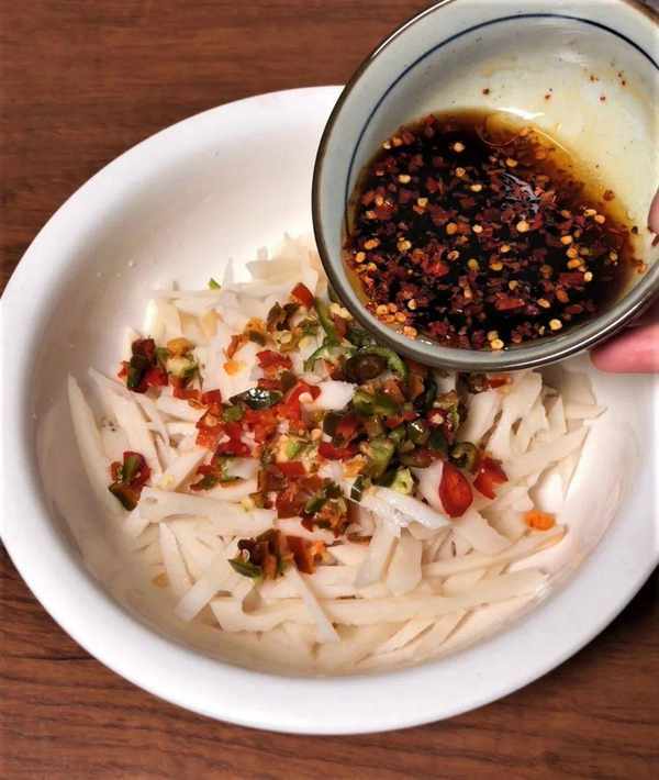 3. 装入碗中,加适量红辣椒��️,一勺热油激发香味。