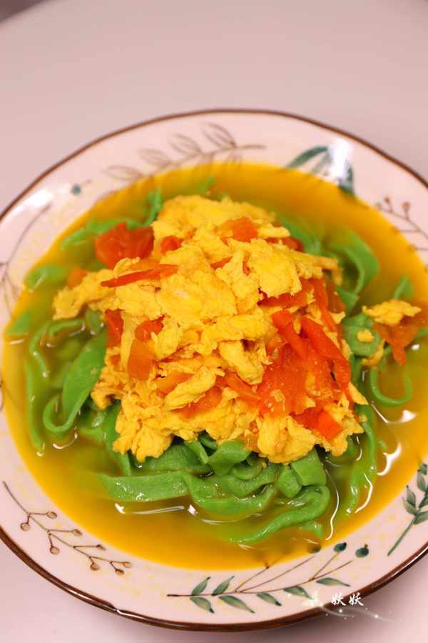 7,将煮好的菠菜手擀面捞出来,浇上西红柿鸡蛋卤,不爱吃饭的孩子也能吃上两碗。