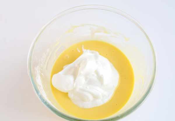 5取三分之一的蛋白霜到蛋黄糊中,用手动打蛋器划“Z”字形轻微快速搅拌几下,这步不用搅拌很均匀,只要混合就好