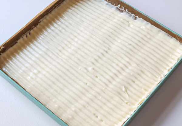 7翻拌好的蛋糕糊,倒入铺好油布的烤盘中(28*28*3),整理平整四周蛋糕糊,再震两下,震去气泡,用锯齿刮板刮出条纹形状
