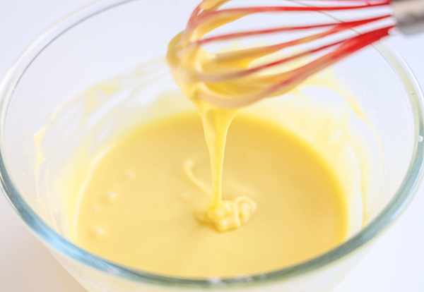 3.加入蛋黄,用手动打蛋划“Z”字形搅拌均匀,搅拌好的蛋黄糊是顺滑流动的,滴落下来面糊是不容易消失的