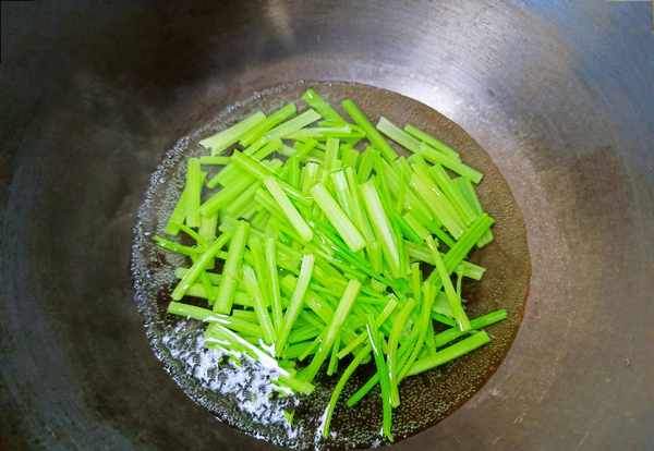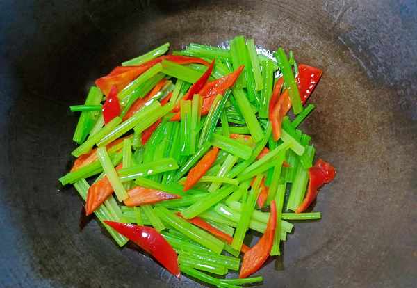 ②锅中滑油,再把辣椒洗干净,切成小块。倒入芹菜、辣椒,开大火爆炒一下。