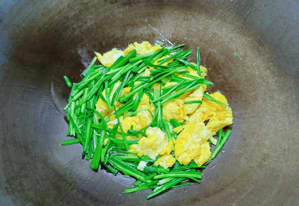 ①我们把鸡蛋打入碗中,搅拌均匀。锅中烧油,倒入鸡蛋炒。蛋液全部凝固后取出来。锅中滑油,倒入韭菜炒。等韭菜颜色加深时倒入鸡蛋,爆炒几下。