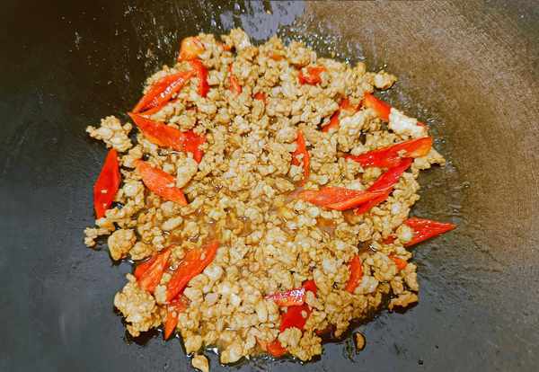 ②里脊肉洗干净,剁成肉末。辣椒洗干净,切成小块。锅中滑油,倒入肉末煸炒。等肉末变色后加点生抽、老抽、蒜末去腥上色,再倒入辣椒一起炒。